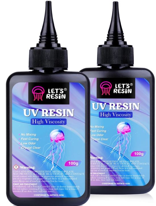 High viscosity UV resin: High viscosity resin is like doming resin. It will not spread quickly and pretty much stays where you put it.